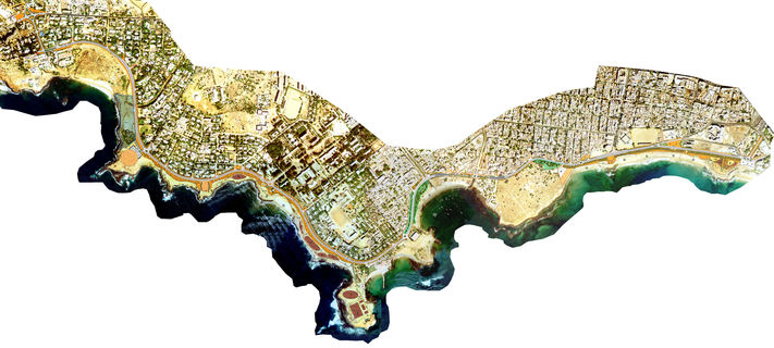 Dans le cadre de l’accueil du Sommet de la Conférence Islamique en 2008, la ville de Dakar se dote d’une succession d’équipements. La corniche ouest fait partie des deux principales infrastructures routières de ce vaste projet et doit être la vitrine du pays en matière d’aménagement urbain. Ce boulevard, reliant l’ensemble des grands hotels, des ambassades, des ministères et des institutions de la ville, traité avec des matériaux simples (béton désactivé et pierre naturelle) anoblis par la qualité des calepinages, ménage de larges perspectives sur l’océan. La diversité de largeur de l’emprise dédiée au projet a guidé l’équipe de conception vers une réponse modulable afin de permettre une adaptation aisée à cette topographie : les calepinages sont traités en ligne brisée, l’éclairage s’installe de manière « aléatoire » par des mâts à projecteurs multiples, les largeurs de trottoirs se dilattent suivant la densité de fréquentation, les revêtements se « déchirent » pour laisser émerger les massifs de plantations… De larges trottoirs s’installent de part et d’autre de la voirie, accompagné du côté de l’océan par une esplanade, véritable belvédère sur l’horizon.